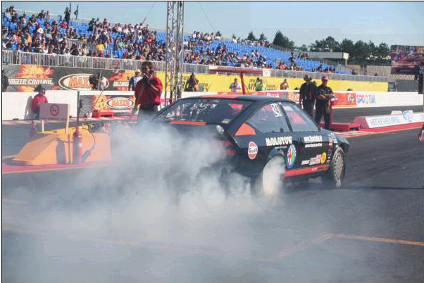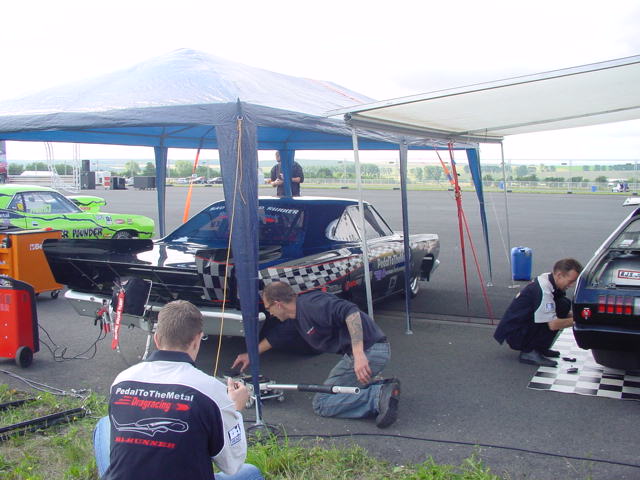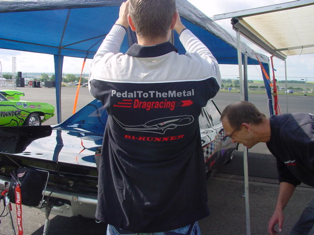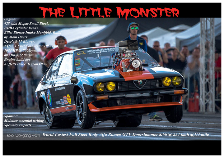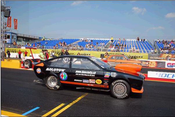Alain Duerr & Jorg Schumacher had a very successful run at the Nitro Olympics in Hockenheim, Germany. They ended up R/U in the Outlaw Race with their might little blown B-1 B/A small block engine in an Alpha Romeo...against many other larger pro mod style combinations. They had to quickly rebuild the frond end from a previous top end accident at a track in Italy, the month before.